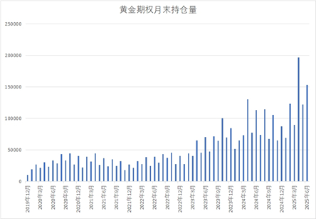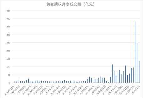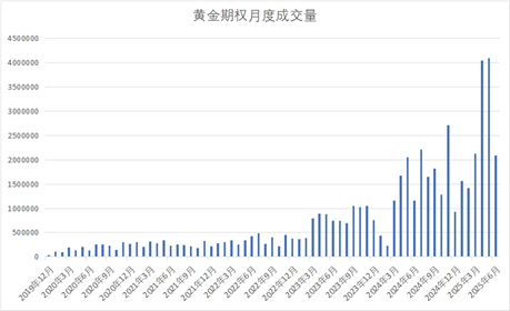 今年上半年黄金期权成交量为1532.16万手,同比增长128.36%,黄金期权成交额为1017.87亿元,同比增长252.64%,6月末黄金期权持仓量15.32万手,同比增长35.54%。其中,4月和5月成交量单月突破400万手,分别为404.46万手和409.29万手,创上市以来新高;4月和5月黄金期权成交额分别为384.75亿元和249.63亿元,创上市以来新高,4月份黄金期权持仓量达到19.67万手,也是创上市以来新高。
