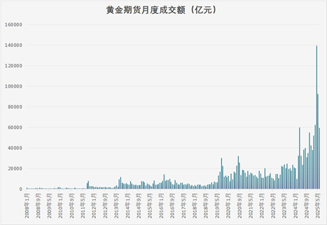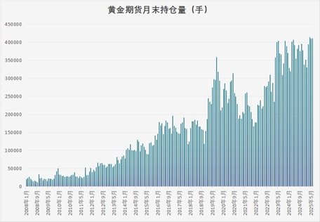 受美国对等关税政策冲击和5、6月的中美双方日内瓦及伦敦经贸磋商影响,今年上半年黄金期货成交量为6015.23万手,同比增长80.35%,黄金期货成交额为44.34万亿元,同比增长149%,6月末黄金期货持仓量41.08万手,同比增长16.1%。其中,4月和5月成交量单月突破1000万手,分别为1803万手和1193万手,创上市以来新高;5月份黄金期货成交额达到9.23万亿元也创上市以来新高,4月份黄金期货持仓量达到41.36万手创上市以来新高,而且黄金期货持仓量在第二季度均在40万手之上,5和6月分别为40.91万手和41.08万手。
