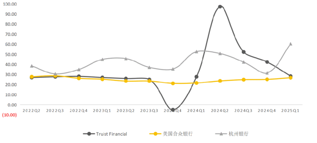 从2024年收入体量看,美国合众银行(约合1965.95亿元人民币)>Truist Financial(约合954.48亿元人民币)>杭州银行(383.8亿元)。