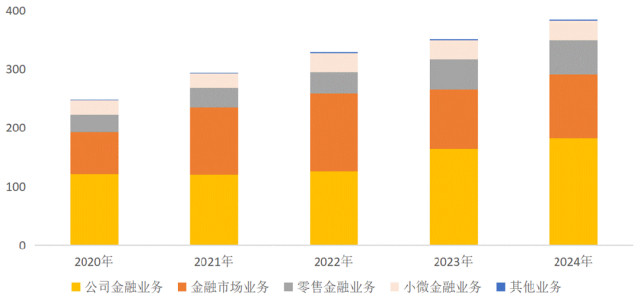 2024年,收入构成中,公司金融业务占比47.48%,金融市场业务占比28.4%。零售金融占比15.23%,小微金融占比8.8%。其中,利息净收入占比63.72%,手续费及佣金收入占比9.7%,投资净收入占比19.1%。