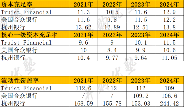 从资产规模看,美国合众银行(48760.2亿元人民币)>Truist Financial(38183亿元)>杭州银行(22223.56亿元)。