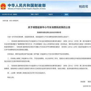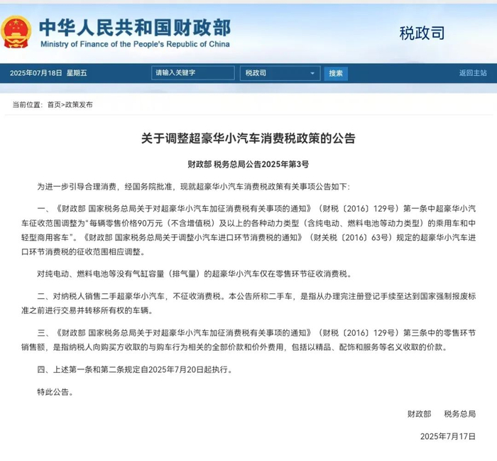 电动知家消息,2025年7月17日,财政部、税务总局发布《关于调整超豪华小汽车消费税政策的公告》,明确自2025年7月20日起,超豪华小汽车消费税政策将进行调整。