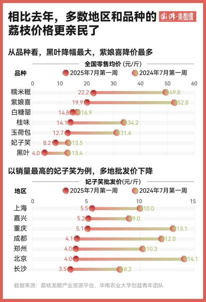 荔枝迎来了大丰收,价格也就更亲民了。数据显示,今年多数品种、多个地区的荔枝价格较去年明显下降。