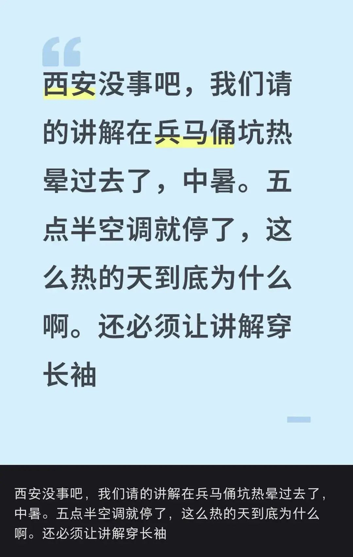 “我们请的讲解(员)在兵马俑坑热晕过去,中暑了。”网友“momo”在社交平台发文分享称,这么热的天,讲解(员)还必须穿长袖,5点半空调就停了,她很不理解。