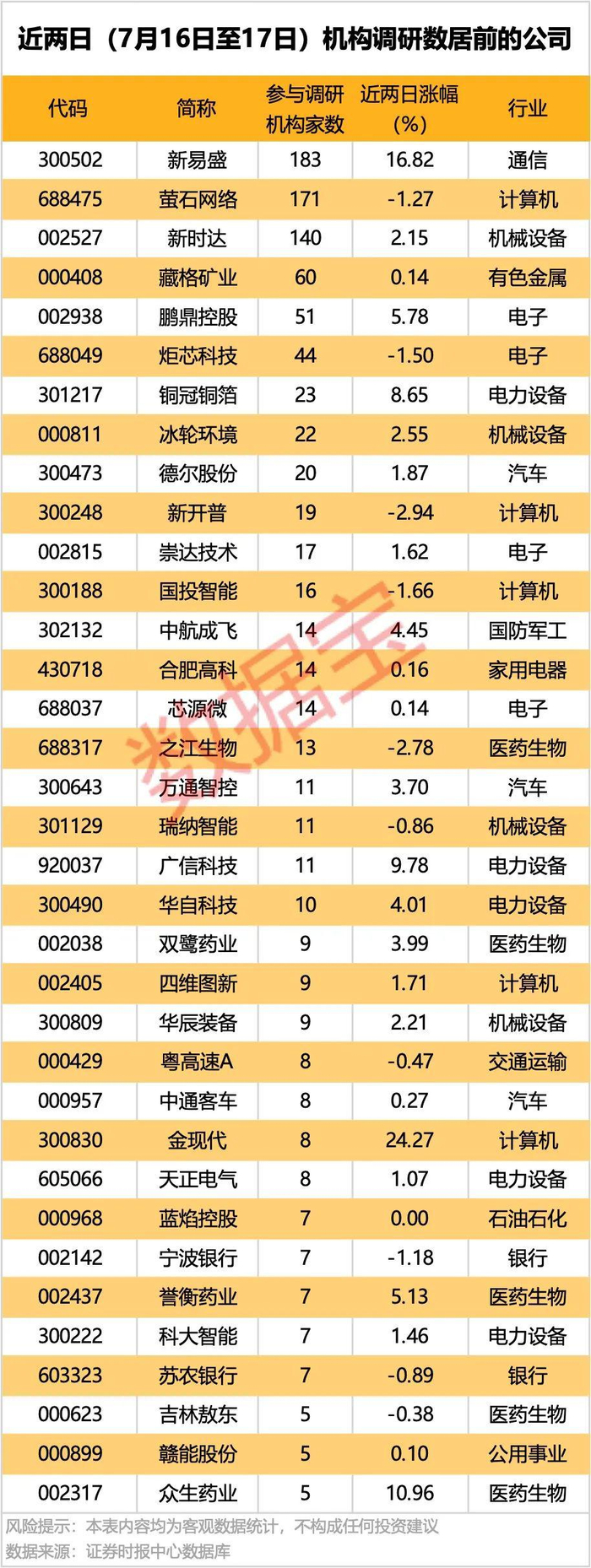 据证券时报·数据宝统计,近两日(7月16日至17日)共有72家公司公告机构调研记录,其中新易盛、萤石网络、新时达调研机构数量均超百家。