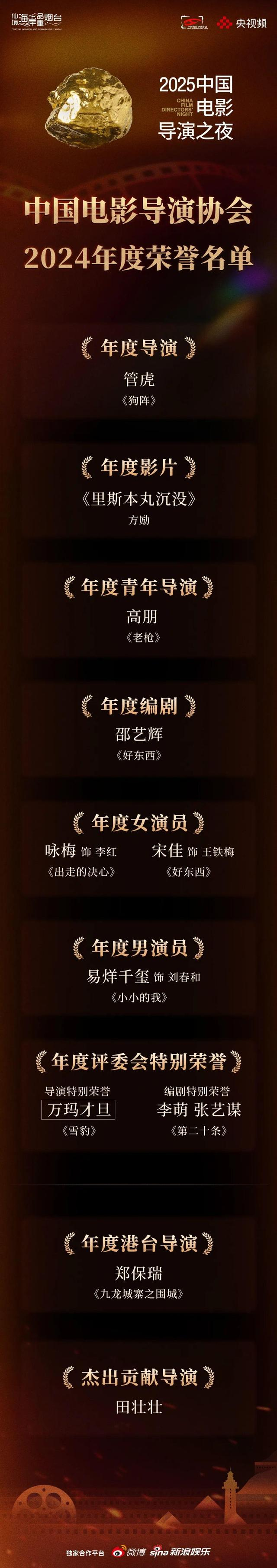 李萌、张艺谋凭借《第二十条》获编剧特别荣誉,导演特别荣誉颁发给已经离世的《雪豹》导演万玛才旦,邵艺辉凭借《好东西》获年度编剧,高朋凭借《老枪》获年度青年导演,郑保瑞获年度港台导演,易烊千玺凭借《小小的我》获年度男演员,宋佳、咏梅分别凭借《好东西》和《出走的决心》获年度女演员,田壮壮获杰出贡献导演,《里斯本丸沉没》获年度影片,导演管虎凭借《狗阵》获年度导演。
