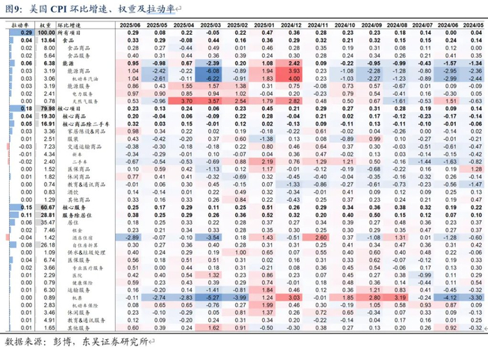 因此,从美国6月CPI数据细节中可看出,关税给核心商品通胀带来的上行压力已部分显露,但由于其在核心商品中的占比不大,因此对总体和核心CPI的贡献度不高。