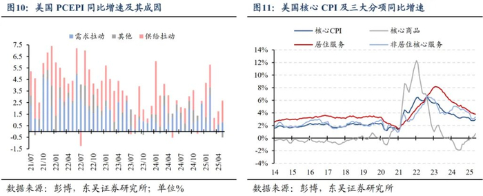 纵向看,关税对美国通胀的综合影响是怎么样的?由于关税本质上是收缩性政策,因此在经济总需求不变的情况下,关税造成的是商品部门的滞胀与服务部门的衰退冲击。因此,在关税给美国核心商品带来通胀压力的同时,美国核心CPI反而在核心服务的拖累下呈现下行趋势。美联储对通胀的拆分显示,今年2月以来,PCE通胀的上行主要来自供给因素,需求因素的贡献则显著走弱。