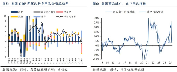 由于市场在去年特朗普胜选时已有较强的关税预期,因此美国贸易商自去年底便开始加速前置商品的进口与补库。2024年12月以来,美国商品进口增速便开始飙升,在25Q1,净出口拖累当季美国GDP增速-4.61%,同时库存变动提振GDP增速+2.59%。这些赶在4月2日对等关税落地前完成的进口在贸易商层面暂缓了关税向美国居民部门的传导。