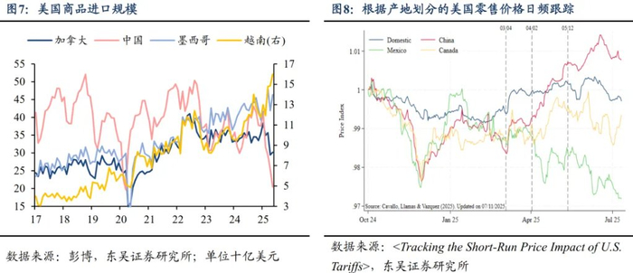 但与上一轮贸易摩擦不同的是,本轮美国关税的最大缓冲地带应该在美国贸易商。本轮美国贸易商通过:①前置商品进口;②加大来自墨西哥的USCMA免税商品和越南的低价商品,来对冲迄今为止的高关税对商品通胀的冲击。此外,从6月CPI数据来看,家居陈设&用品、服装、休闲商品等关税敏感项目价格环比增速加快,但由于其在核心商品中的占比不大,因此对总体和核心CPI的贡献度并不高。