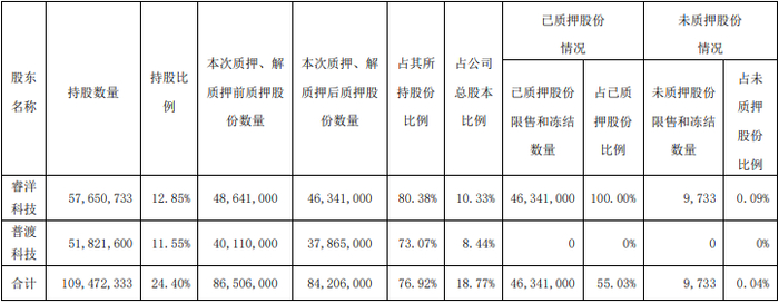 截至2025年6月5日,本次质押、解质押后,睿洋科技质押股份数量为46,341,000股,占其所持股份比例80.38%,占公司总股本比例10.33%;睿洋科技及其一致行动人普渡科技质押股份数量为84,206,000股,占其所持股份比例76.92%,占公司总股本比例18.77%。