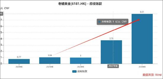 对于老铺黄金,其客群主要面向C端人群。颇为诧异的是,公司应收账款由2022年的1亿元激增至2024年的8.01亿元。