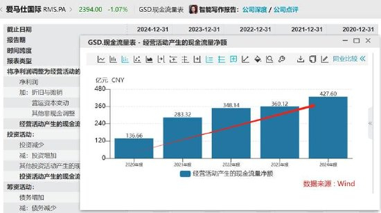 老铺黄金相比高奢品及同行,其现金流可谓云泥之别。Wind数据显示,爱马仕国际经营现金流持续高增,LVMH集团现金流常年维持1500亿水平。