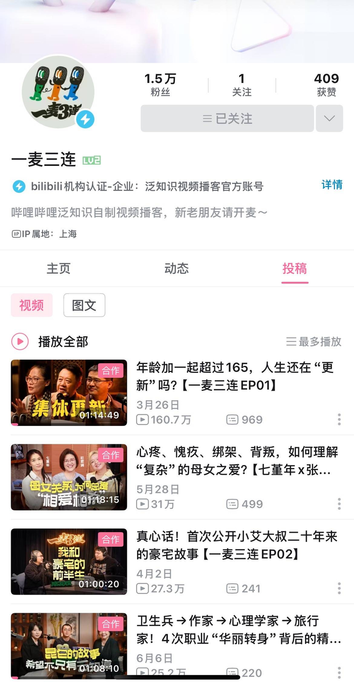 B站发力视频播客并不突然。早在3月26日,B站上线了自制视频播客节目《一麦三连》,首期节目邀请到了罗翔、刘擎和毛尖。三位UP主围坐对谈,面前各放置了一支麦克风。目前,该节目已经更新了七期,首期节目在B站上的播放量已经达到了160万,其余六期节目正片播放量大部分为二三十万。同时,B站还在积极吸引播客节目入驻。