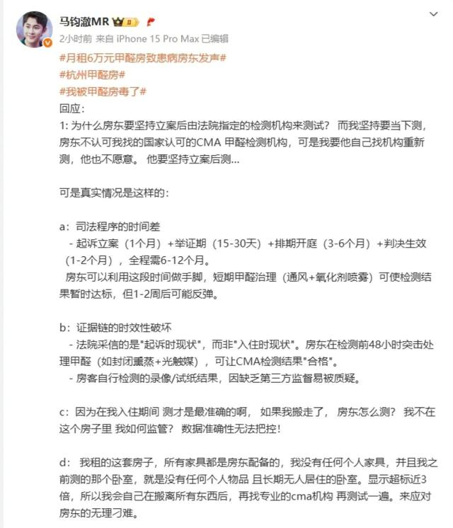 对于房东所说的情况,租客马先生发文称,“所有照片是房东自己发在社交媒体上的,我引用的截图。我被甲醛房毒害近5个月,拿着证据找房东,他置之不理,让我随便告,要我用自己的方式维权。我该怎么办?”