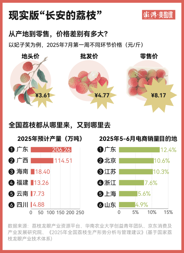 以大家最为熟知的“妃子笑”为例,从地头到全国各地零售,价格平均下来仅翻了一倍多。