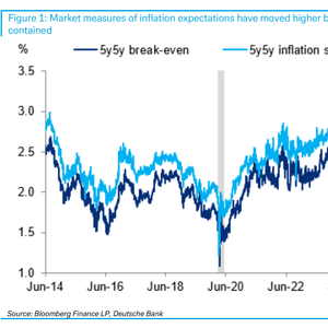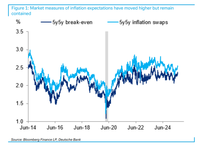 华尔街见闻文章显示,美国6月核心CPI连续5个月低于预期,市场通胀预期指标也显得相对温和。德银分析指出,近期,衡量市场长期通胀预期的关键指标——5年期、5年期远期盈亏平衡通胀率(5y5y breakevens)和通胀互换(inflation swaps)——虽然已升至近十二个月的高位,但整体仍处于受控区间。