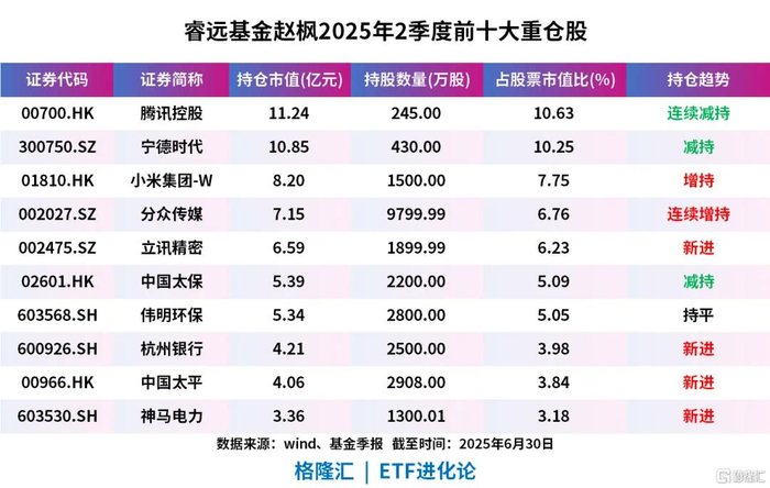 截至二季度末,赵枫旗下前十大重仓股依次为:腾讯控股、宁德时代、小米集团-W、分众传媒、立讯精密、中国太保、伟明环保、杭州银行、中国太平、神马电力。