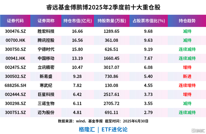 较一季度末,二季度傅鹏博新进CPO龙头新易盛,油气开采股广汇能源则退出十大重仓股;二季度减持胜宏科技、腾讯控股、宁德时代、中国移动、三诺生物、迈为股份;增持立讯精密、寒武纪、巨星科技。