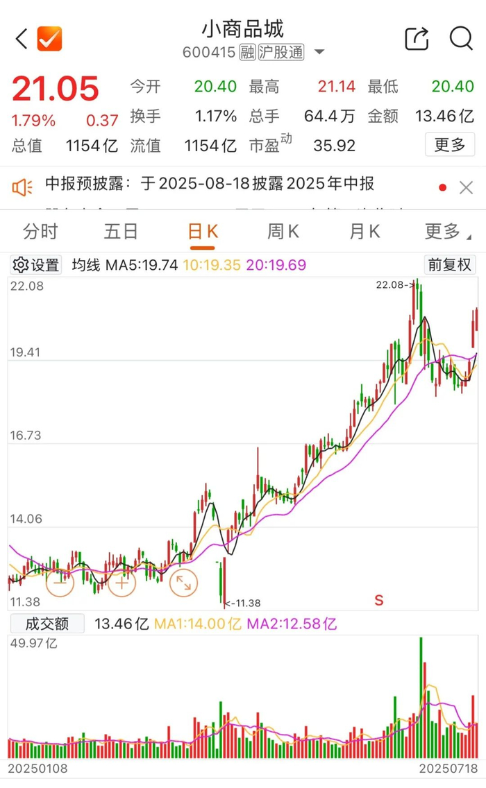 7月18日开盘,小商品城股价再创新高,盘中一度冲高至21.14元/股。截至收盘,小商品城股价涨1.79%,最新市值1154亿元。