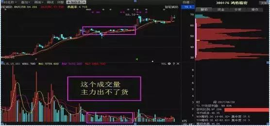 高位指的是股价处于或接近历史高位,高位无量横盘走势,是典型的上涨中继形态,此时不宜轻易出局。只有经过一段时间的观察,发现高位横盘时成交量萎缩严重,而且往往是上涨有量下跌无量,到最后能够打破平衡再度向上时,我们才能真正确定新的行情又来了。大家看鸿特精密就是比较好的例子,股价在前期放量拉升翻倍上涨,随后在高位无量盘整,要只知道如此缩量的情况主力是根本没有空间出货的,所以我们看到在洗盘一段时间主力再度向上拉升。