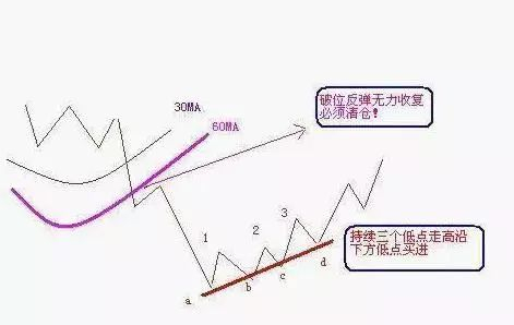 在随后的时间里,必须耐心等待股票见底,比如图一表明的,出现持续三个低点走高,可以沿下方低点买回前期清仓筹码。A-D点都是买回的机会,不过前两个低点只能够试探买进,毕竟探底趋势还在进行,以防再次下行。