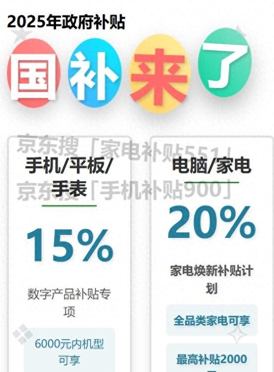 数码:单价6000元以内手机、平板、手表补贴15%(上限500元);
