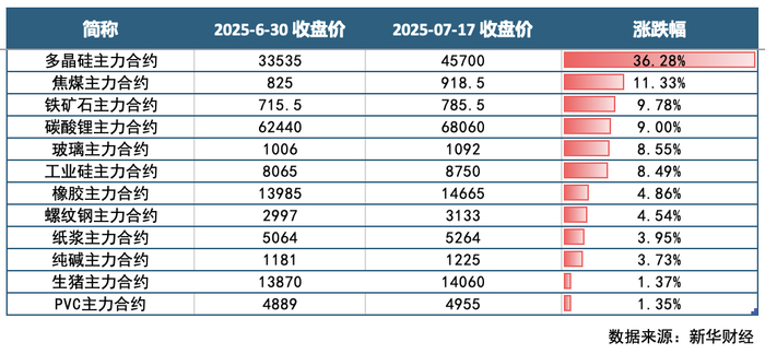 据统计,截至7月17日收盘,7月以来多晶硅主力合约大涨超36.28%,焦煤主力合约上涨11.33%,铁矿石主力合约涨9.78%,玻璃主力合约上涨8.55%,螺纹钢主力合约上涨4.54%,橡胶主力合约涨4.86%。