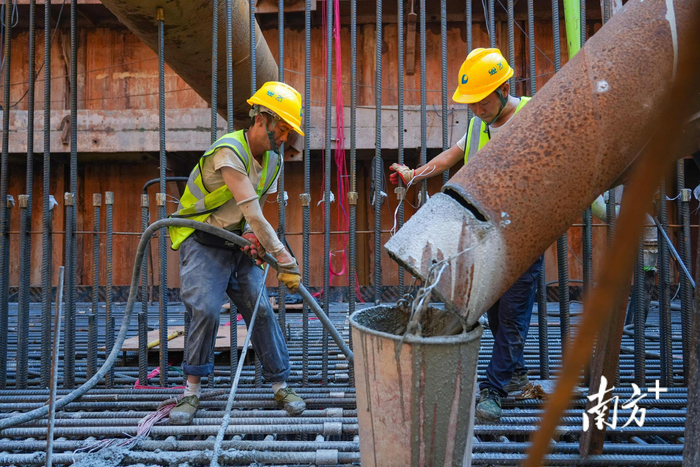 本次承台混凝土浇筑采取“双点分层浇筑、同步进行,逐步推进”的方法。“项目统筹安全质量管控,混凝土浇筑前认真开展技术交底工作,浇筑期间项目领导带班,现场负责人、专职安全员等关键岗位轮流值班,全程盯控鸡鸦水道水位、混凝土质量以及振捣情况,确保现场施工作业安全有序高效推进。”保利长大广珠段改扩建项目TJ3标项目副经理陶煜峰表示。
