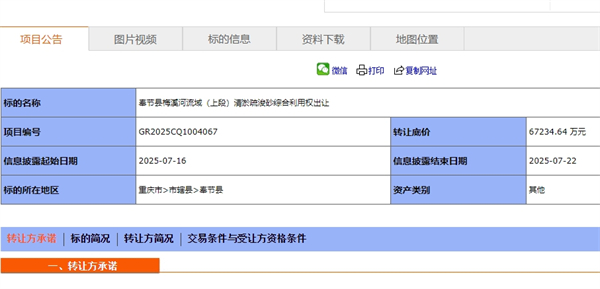 奉节县梅溪河流域(上段)清淤疏浚砂综合利用权涉及清淤疏浚河段共计6个(梅溪河5个、车家坝河1个),清淤区河段长度共计59.97km,清淤疏浚总量约1240.48万方(其中:砂868.36万方,石372.12万方),转让底价超6.72亿元,单价约54.2元/方。