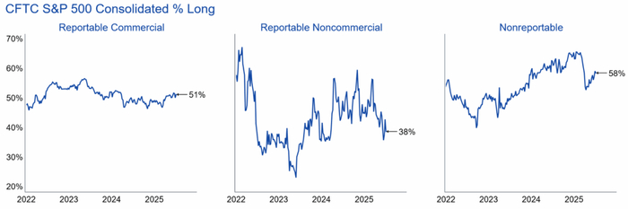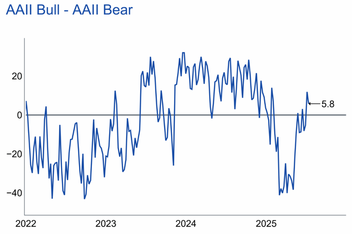 根据过去几周与机构投资者的对话,情绪并不极端。AAIIBULL(周环比下降)和AAIIBEAR(周环比上升)也证明了这一点。