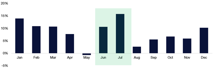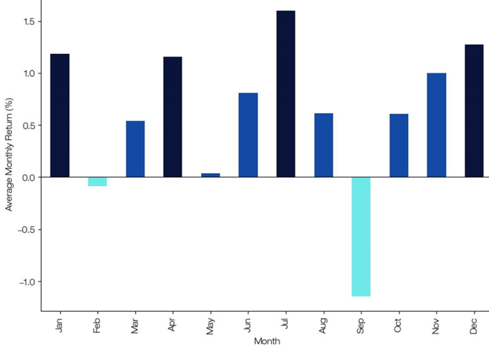 7月的季节性因素对美国股票非常有利。自1928年以来,7月是标普500指数一年中表现最好的月份,而9月是表现最差的月份,因为投资者要"返校"。标普500指数有望在7月实现连续第11个月上涨。Citadel Securities的夏季交易活动与股票需求的大幅增加一致,而其他投资者则远离他们的交易终端。