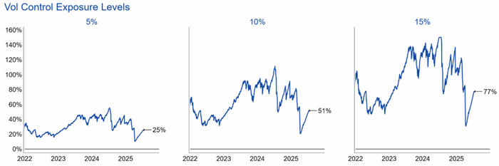 风险平价策略也从较长期的实际波动率市场中获取输入。我们估计,与历史背景相比,风险平价策略的股票敞口也较低。现货/波动率相关性在跨资产中继续正常化,我们测量的资产组合(分别为股票、国债、原油和黄金)。