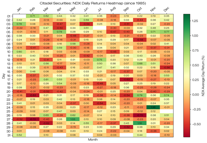 Citadel Securities:纳斯达克100日回报热图(自1985年起)