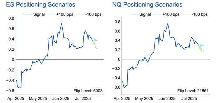 CTA关键触发水平:Citadel Securities宏观策略团队Grant Wilder估计,ES1"触发"水平为6003,而当前现货为6280,NQA"触发"水平为21861,而当前现货为23006。当前现货与这些策略将被迫转为空头敞口的中期阈值水平之间存在相当大的距离。