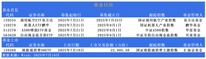 具体来看,下周一开始募集的有通用航空ETF易方达(159255)、机器人ETF鹏华(159278)、华夏A500增强ETF基金(512370)、兴业自由现金流全指ETF(563620)。分别跟踪国证通用航空产业指数、国证机器人产业指数、中证A500指数、中证全指自由现金流指数。