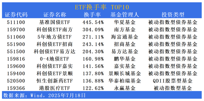换手率方面,基准国债ETF(511100)换手率居首,达445%。科创债ETF南方(159700)、5年地方债ETF(511060)、科创债ETF招商(551900)换手率居前。