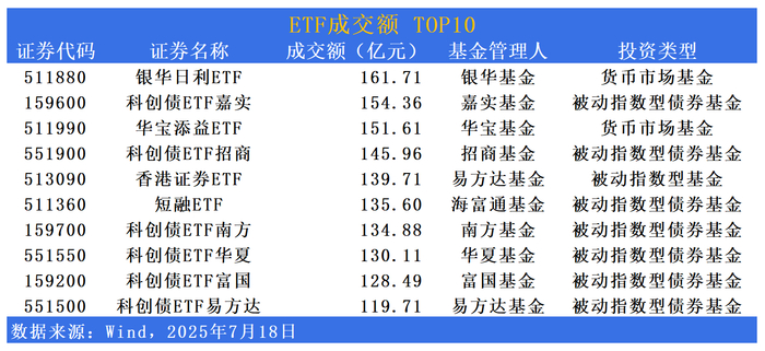 成交额方面,银华日利ETF(511880)成交额居首,达161亿元。科创债ETF嘉实(159600)、华宝添益ETF(511990)、科创债ETF招商(551900)成交额紧随其后。