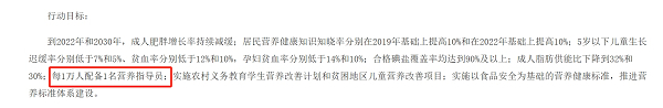 国务院发布的《健康中国行动(2019-2030年)》指出,到2030年,要实现每1万人就配备一名营养指导员。按照这一目标算,我国现阶段至少还需要十几万营养师。若是按照发达国家平均每300个人配备一名营养师的比例算,未来我国营养师人才缺口预计将高达400万,可见营养师这一赛道的巨大潜力和广阔的发展前景。