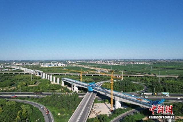 7月18日,雄忻高铁保定东特大桥跨京港澳高速连续梁中跨合龙。(无人机照片)中国铁路北京局集团有限公司 供图