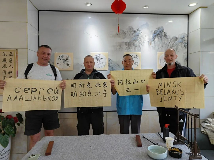 5月1日,阿拉山口市阿拉套街道友好社区举办书法文化交流活动,邀请50余名外籍友人参与。图为外籍友人与社区工作人员展示作品。张 倩摄