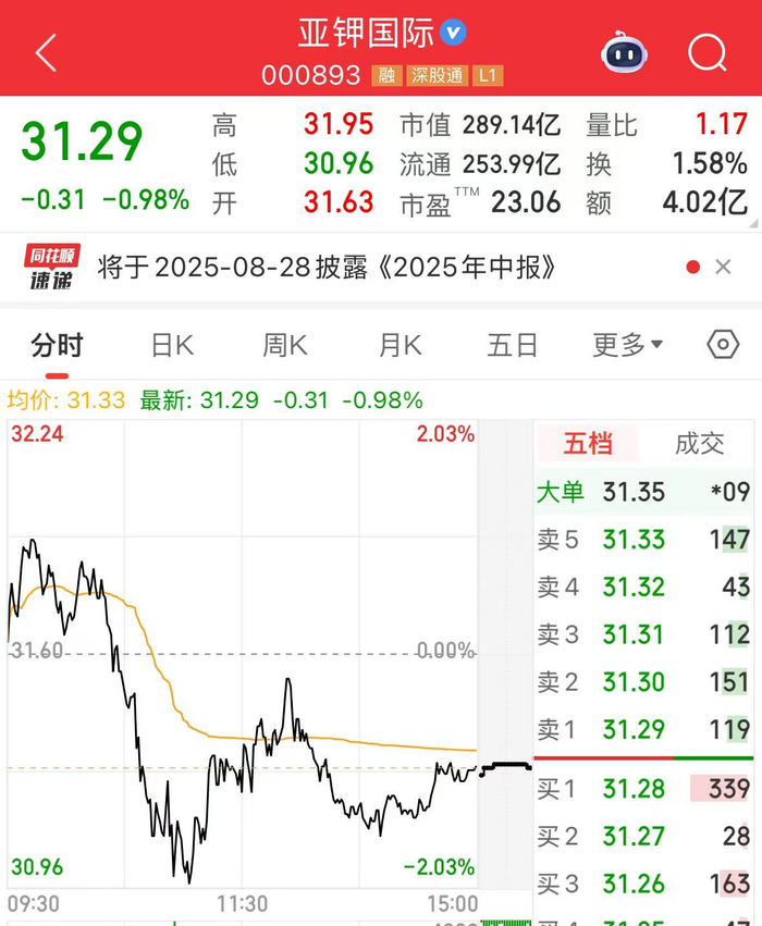 截至18日A股收盘,亚钾国际股价下跌0.98%。