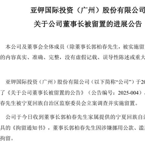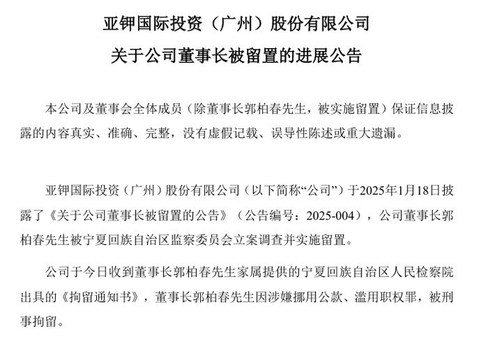 亚钾国际董事长郭柏春被刑拘!涉嫌挪用公款、滥用职权罪,他曾任副市长,去年在境外落网被遣返回国