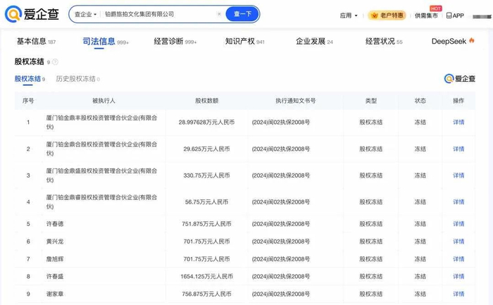 风险信息显示,该公司存在数百起法律纠纷,曾因“买卖合同纠纷”“服务合同纠纷”等被多次起诉;该公司现存多条股权冻结信息,被执行人包括厦门铂金鼎丰股权投资管理合伙企业(有限合伙)、许春盛等。