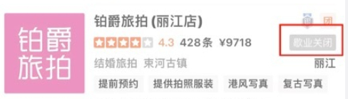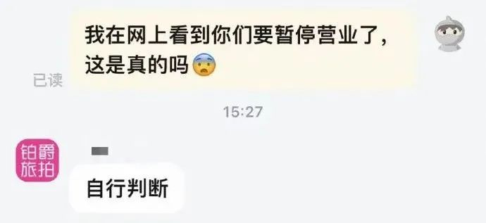 7月18日,有消费者就告知书的真实性咨询铂爵旅拍客服时,一电商平台旗舰店的客服仅回复“自行判断”。目前,铂爵旅拍多个门店电话关机,丽江店明确显示“歇业中”,官方客服热线也无法接通。