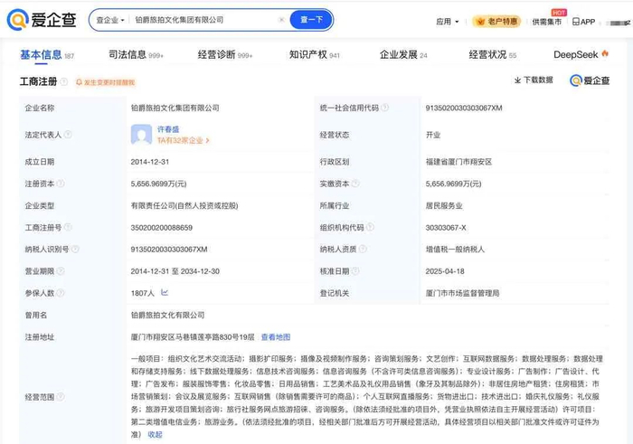 爱企查App显示,铂爵旅拍关联公司铂爵旅拍文化集团有限公司成立于2014年12月,法定代表人、董事长、总经理均为许春盛,注册资本约5657万元人民币,经营范围包括组织文化艺术交流活动、摄影扩印服务、摄像及视频制作服务等。股东信息显示,该公司由许春盛、谢家章、华润国调(厦门)股权投资合伙企业(有限合伙)等共同持股。