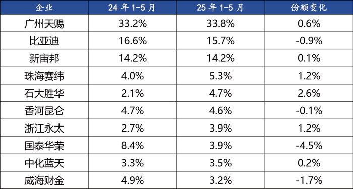 25年1-5月,电解液头部效应依然明显,市占率稳步提升,其中,前三市占率为63.72%,前五市占率为73.67%,前十市占率为92.76%。整体上看,第一梯度的基本份额维持稳定,第二梯度份额提升明显。预计下半年,市场份额集中度仍有进一步的提升,部分强二梯度厂商的出货量仍围绕着宁德供应提升出货量。