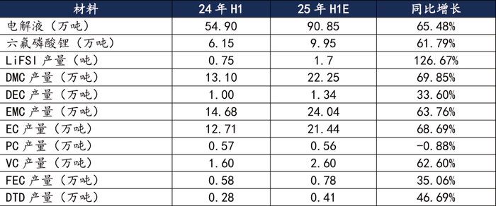 根据广东省电池行业协会产业研究中心统计显示,2025年1-6月份电解液产量90.85万吨同比增长超过65%;DEC/FEC/PC由于电池用量减少,产量增长速度远低于电解液需求增长;LiFSI维持高增长态势,2025年H1产量1.7万吨同比增长126.67%;2024年LiFSI/六氟磷酸锂为12%,2025年上升至17%,提升5pct。