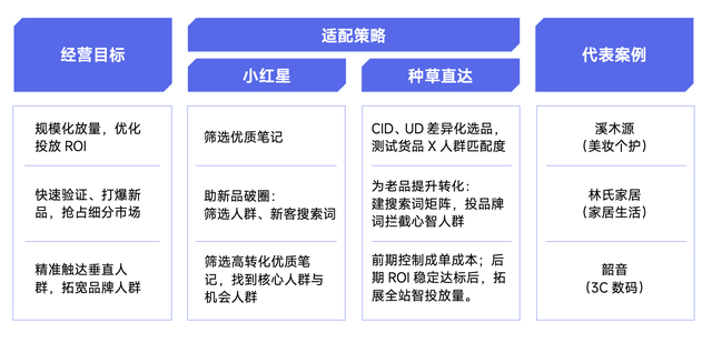 如溪木源在种草直达时同时进行CID和阿里UD双侧投放:在UD链路中,优先选择天猫店铺销量TOP1产品,借助站外成熟的消费人群画像提高投放精准度,实现站外销量的规模化增长,稳守电商销量榜单位置;CID链路中,则选择小红书站内高人群资产SPU,促进站内已种草人群成交。