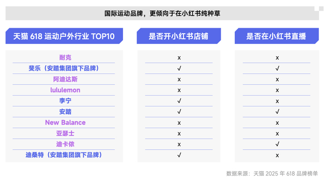而在天猫运动户外行业TOP10品牌中,安踏集团旗下的斐乐、安踏和迪桑特都在小红书开了店铺。其中安踏主品牌和斐乐更是维持了高频次开播。今年3-5月,两个品牌平均每个月开播约30场。耐克、阿迪达斯、lululemon、New Balance等几大国际运动品牌,既没有开红店、也没有开播——这并不意味着它们不重视小红书。